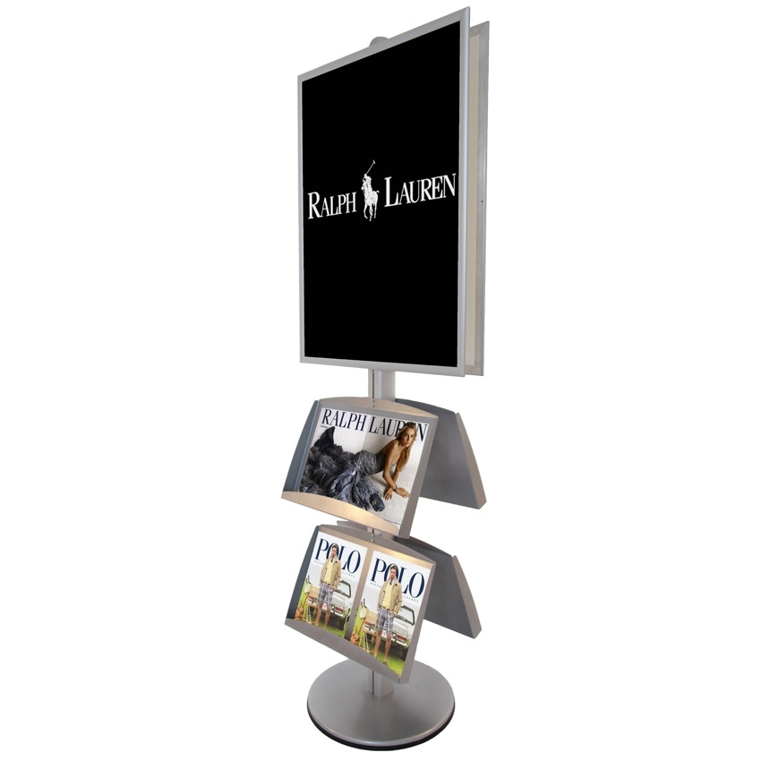 Dobbeltsidet Info display af aluminium med stålhylder og en ekstra tung fod for stabilitet.