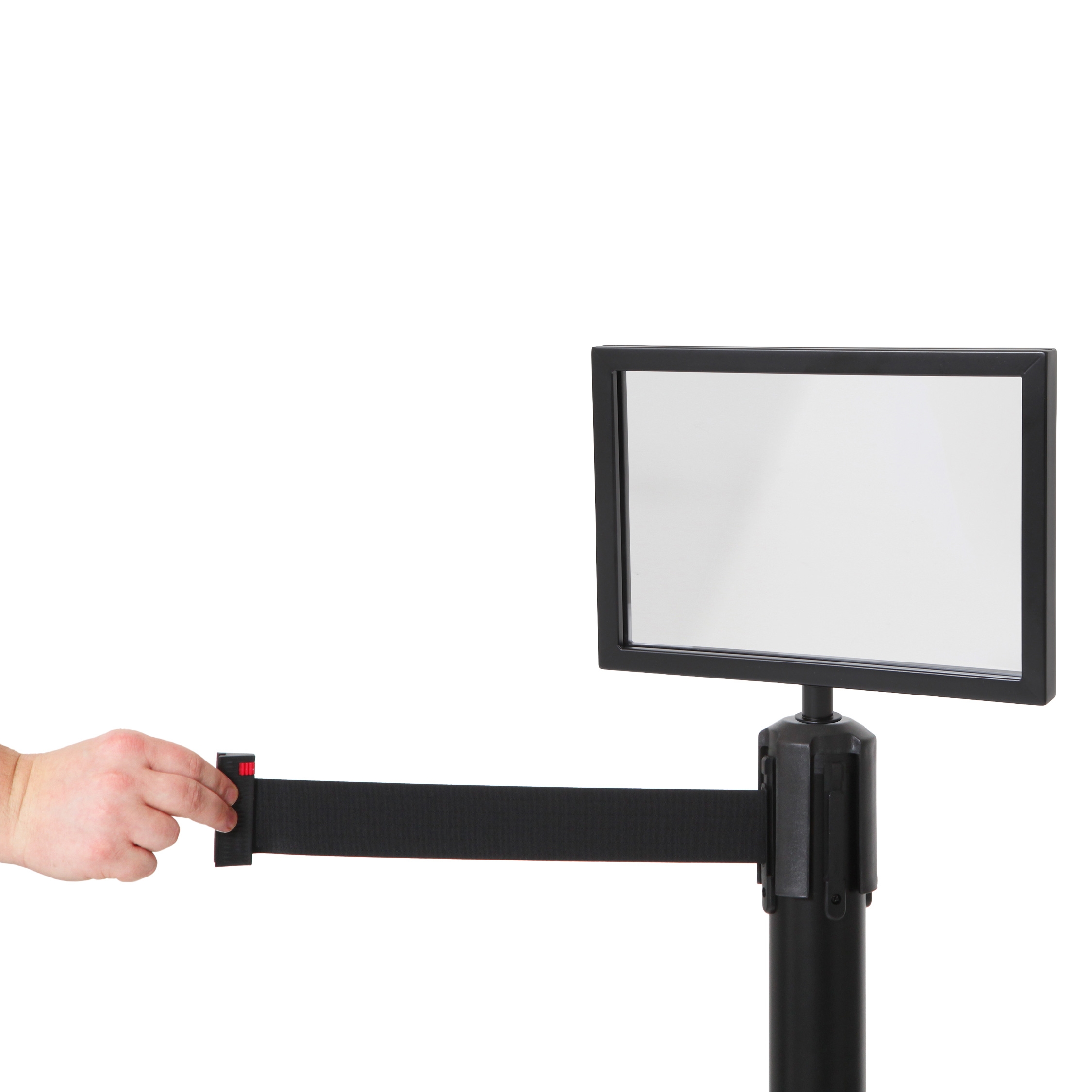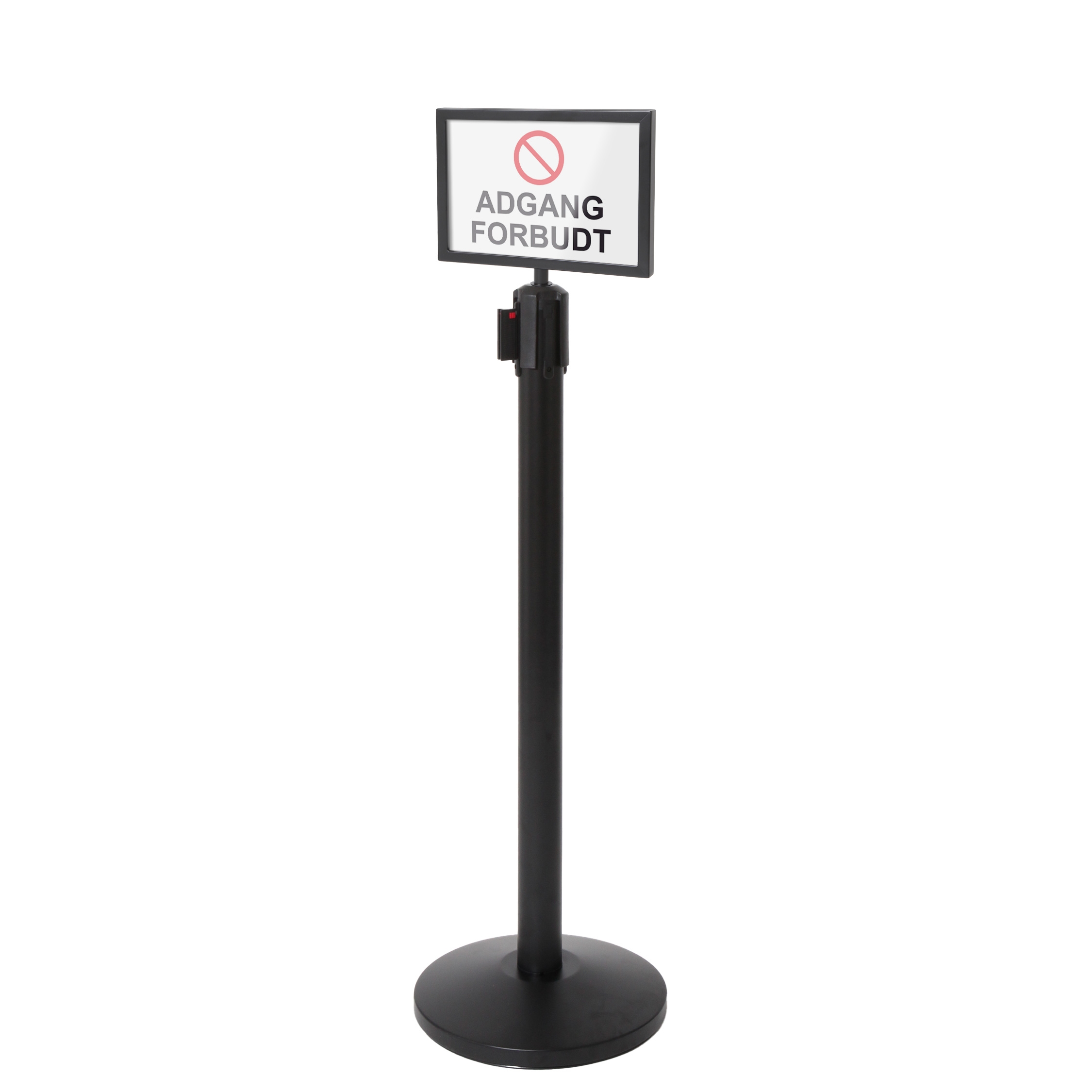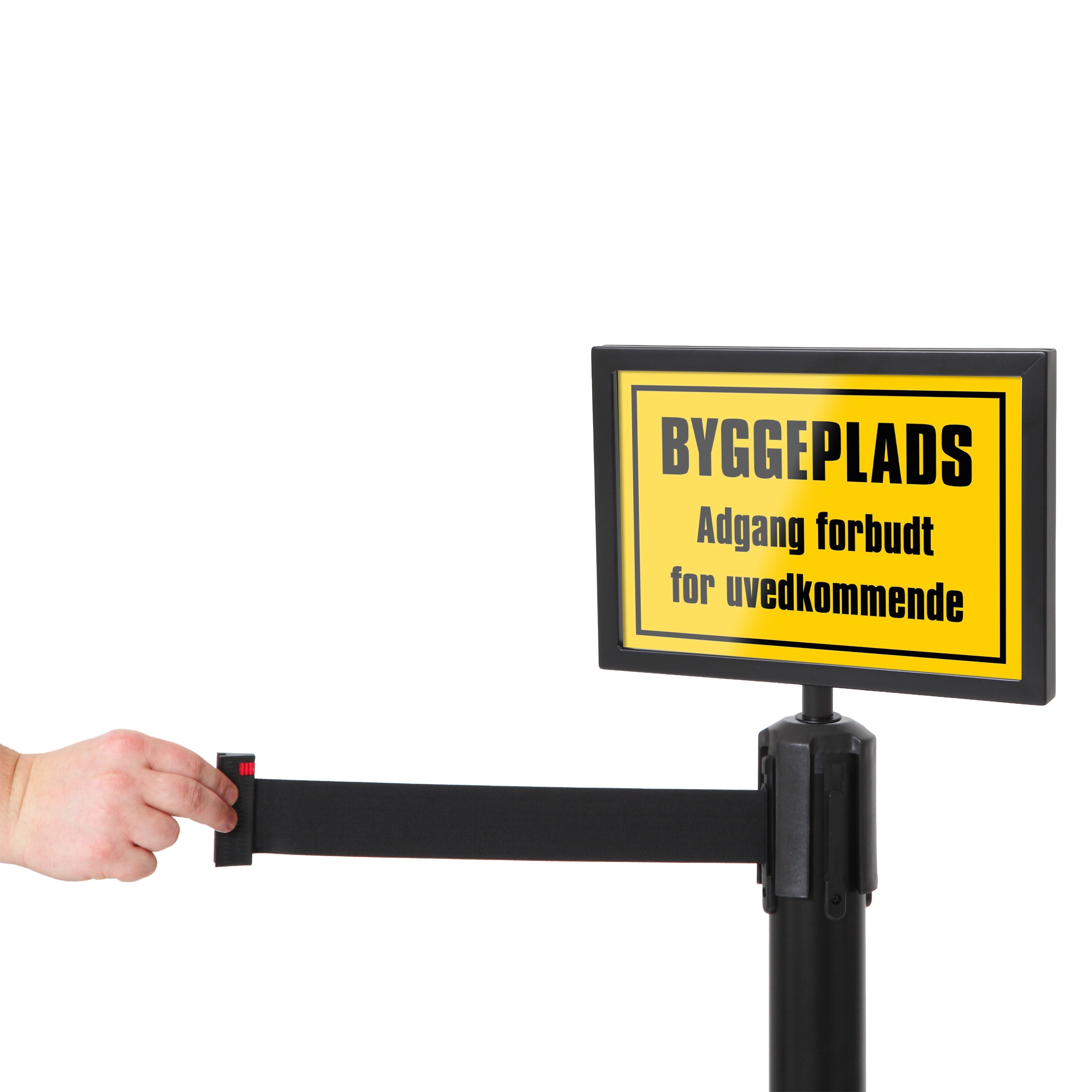 Elegant sort A4 plakatramme i bredformat, designet til montering på afspærringsstolper med bånd. Perfekt til tydelig information, advarselsskiltning eller retningsvisning i områder med afspærring.