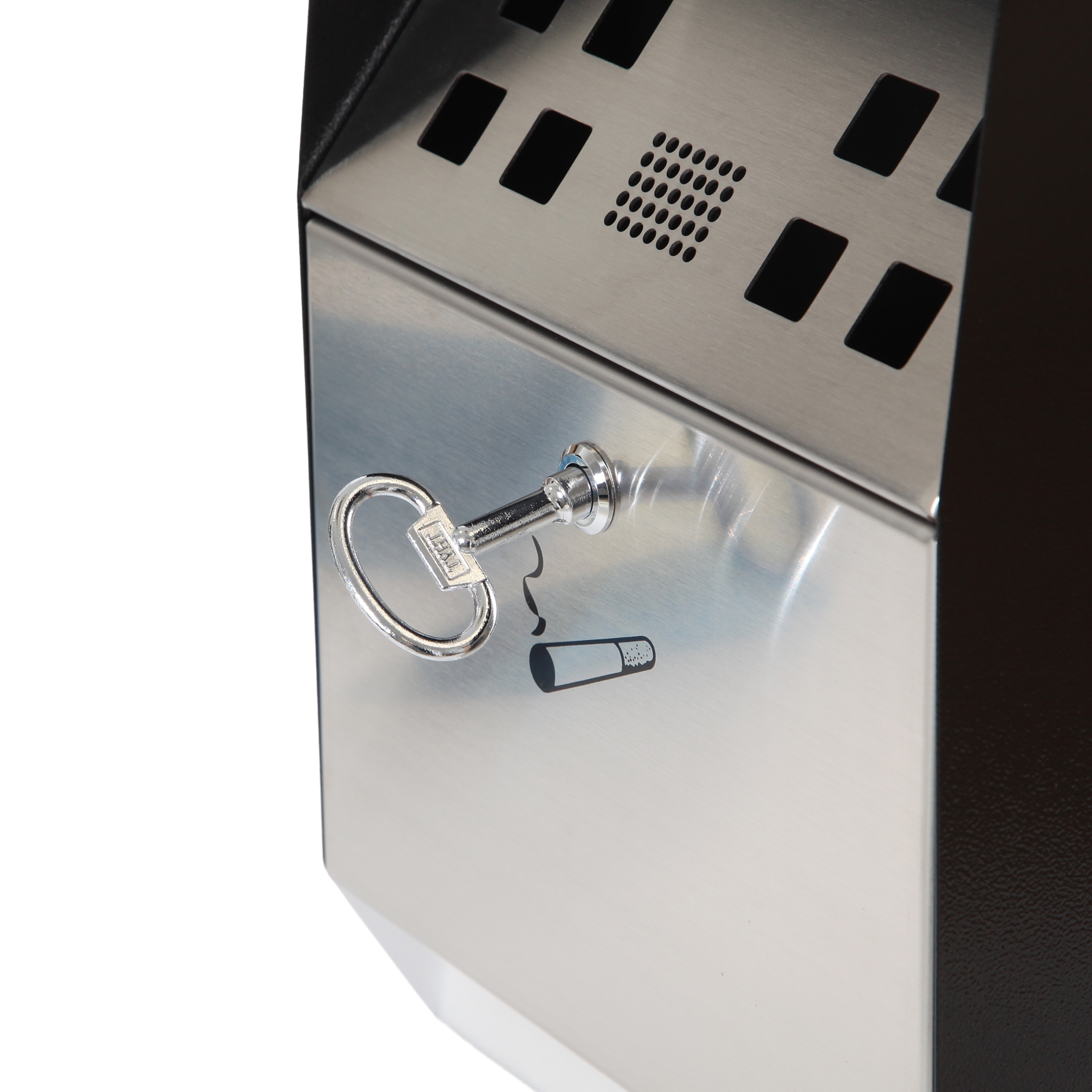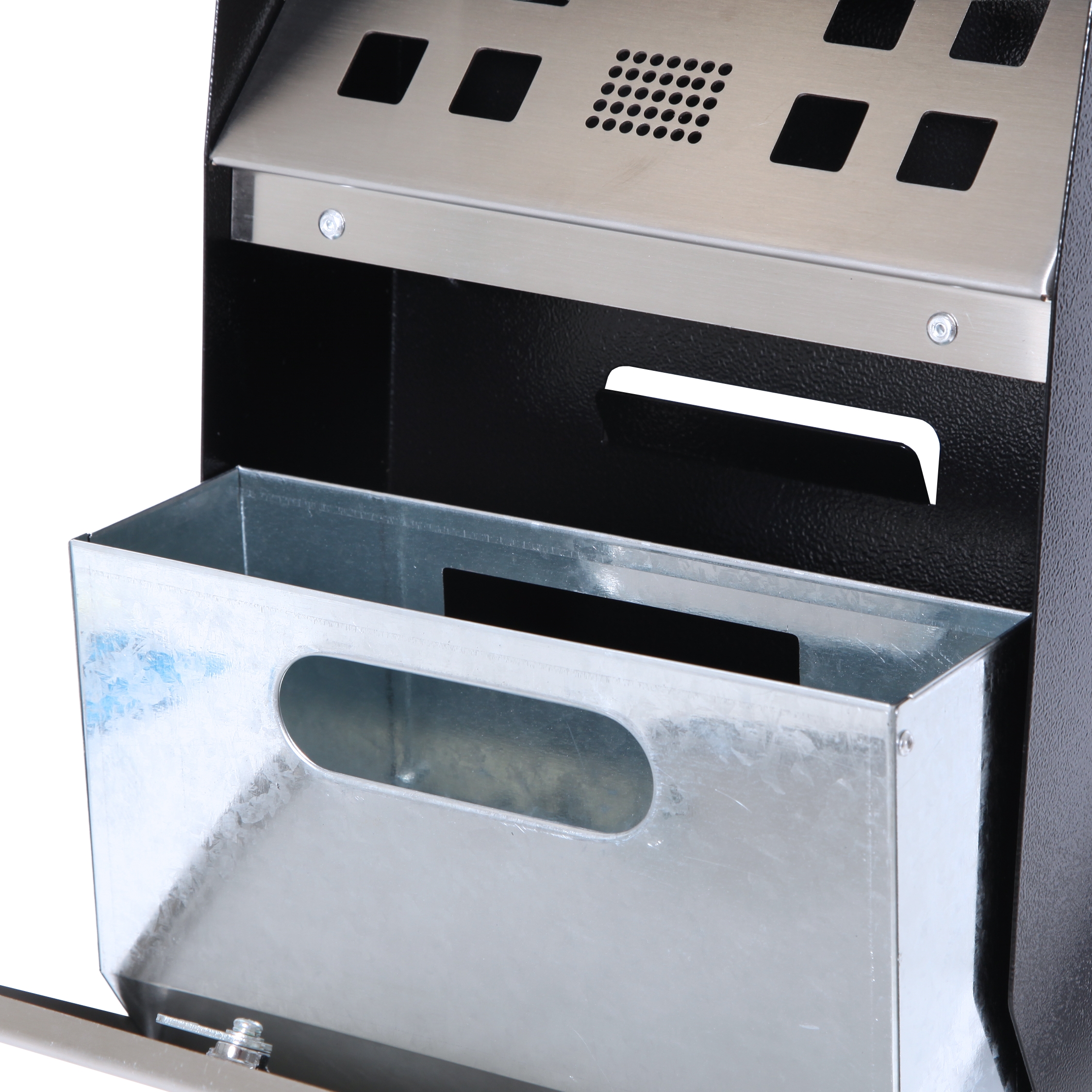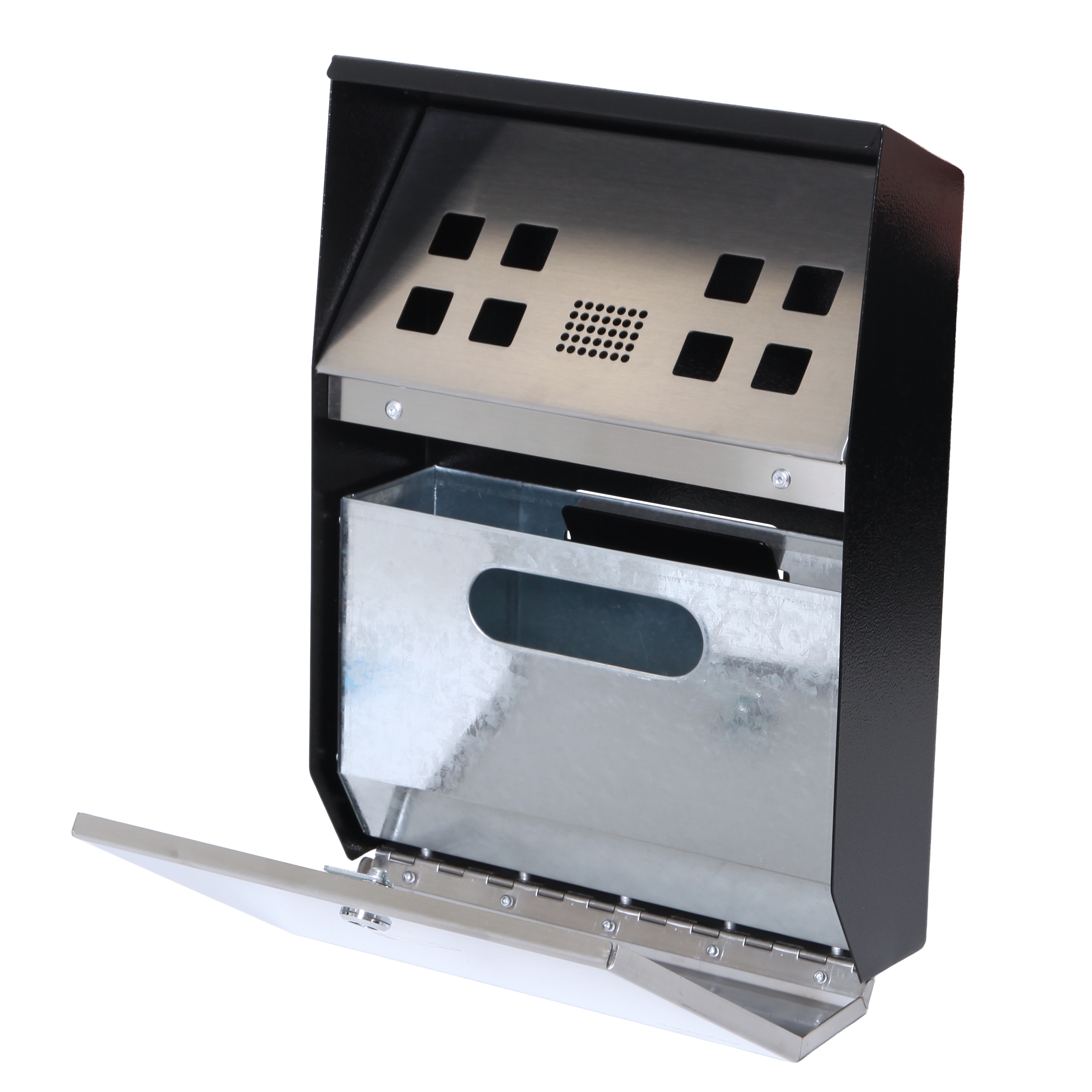 Et kvalitetsstærkt og vejrbestandigt udendørs askebæger til vægmontering, fremstillet i sort pulverlakeret galvaniseret stål med en front i rustfrit stål 316, som giver en særdeles høj modstandsdygtighed mod rust og gør askebægeret ideelt til både offentlige miljøer og kystnære områder. Kombinationen af stærke materialer giver en flot finish og en konstruktion, der holder til daglig udendørs brug året rundt. Askebægeret har flere indkast med grill samt en låsbar front, som gør både brug og tømning nemt og sikkert.