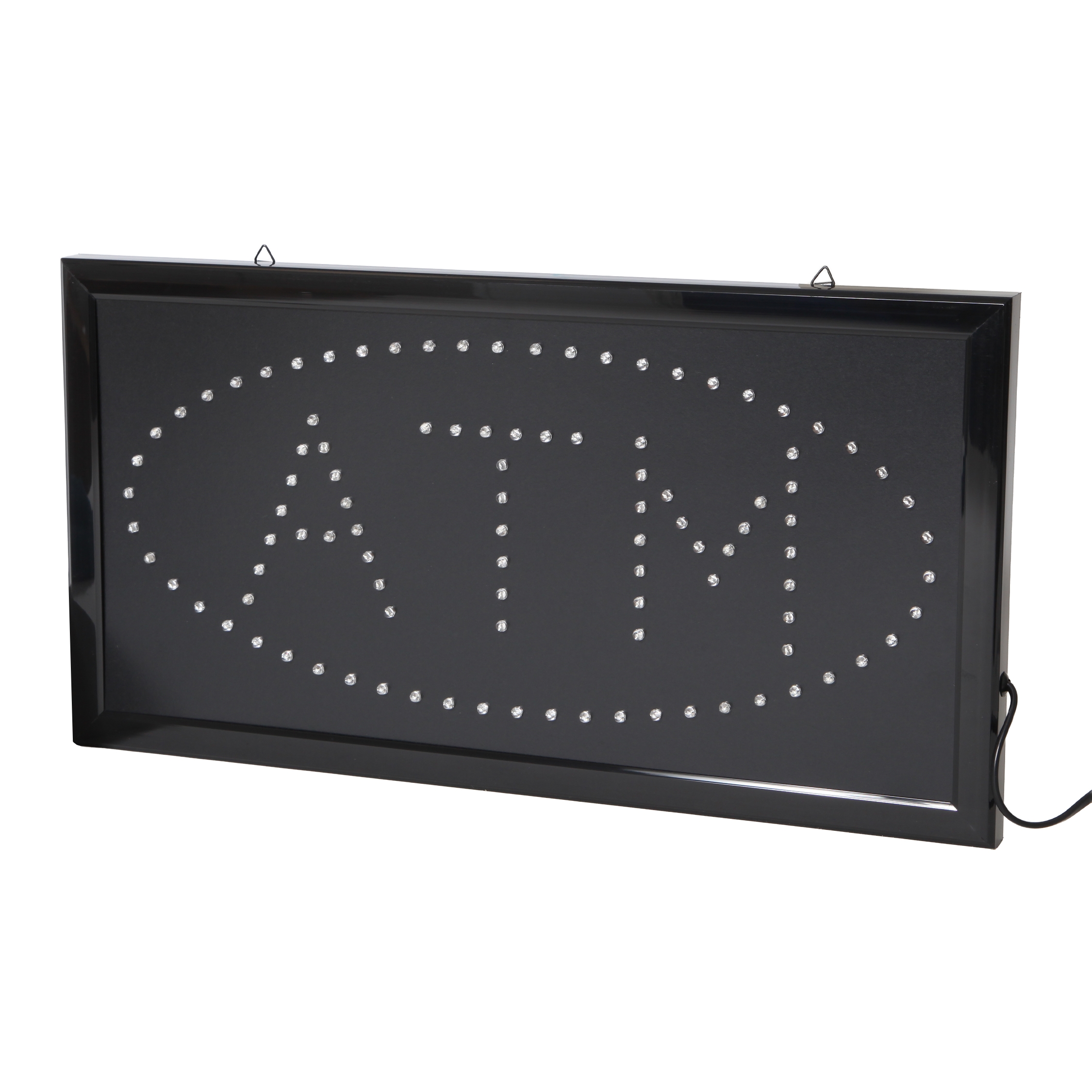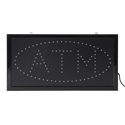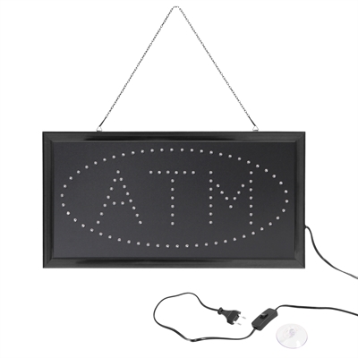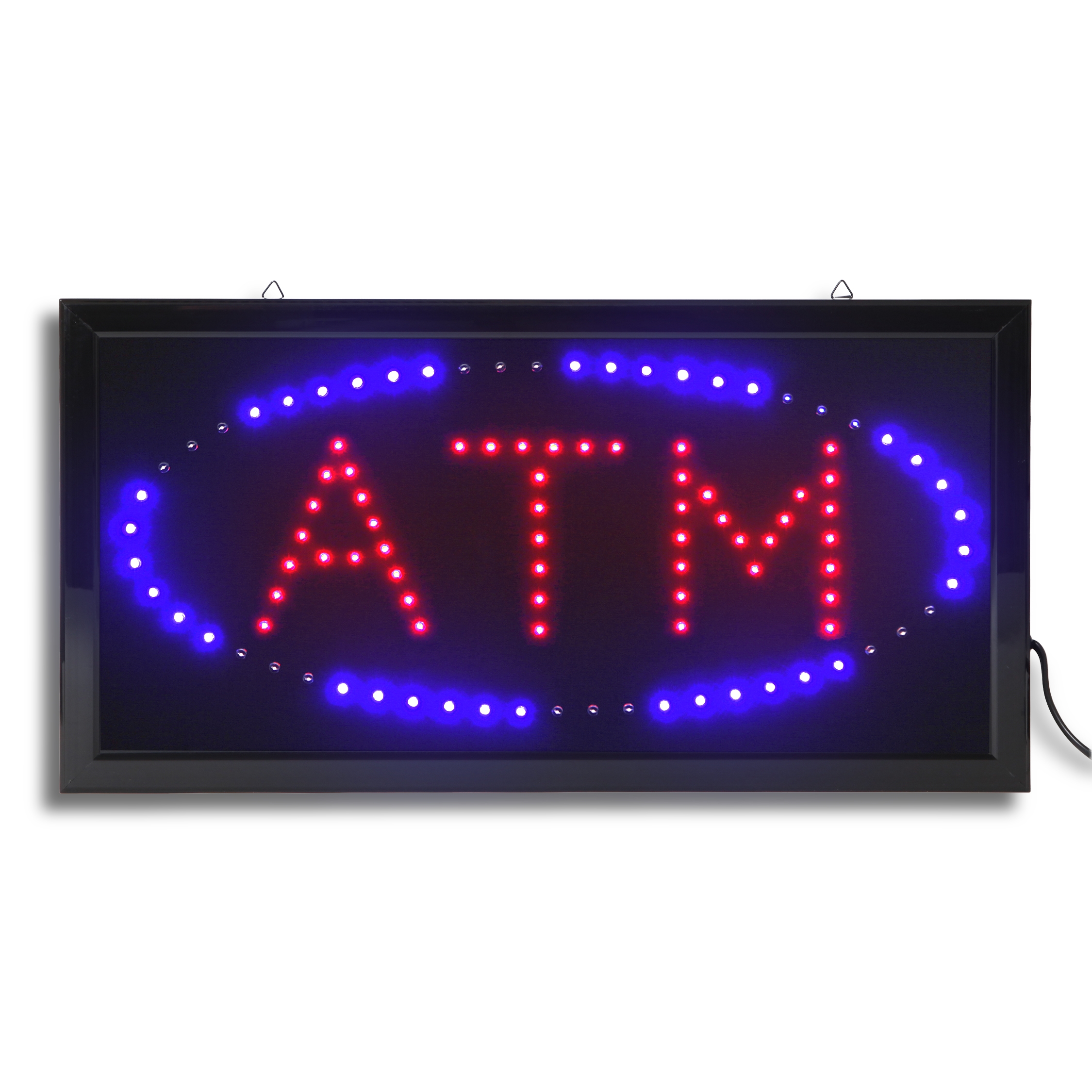 Super kraftigt blåt og rødt LED lysskilt med teksten "ATM" til ophængning i vindue eller på væg.