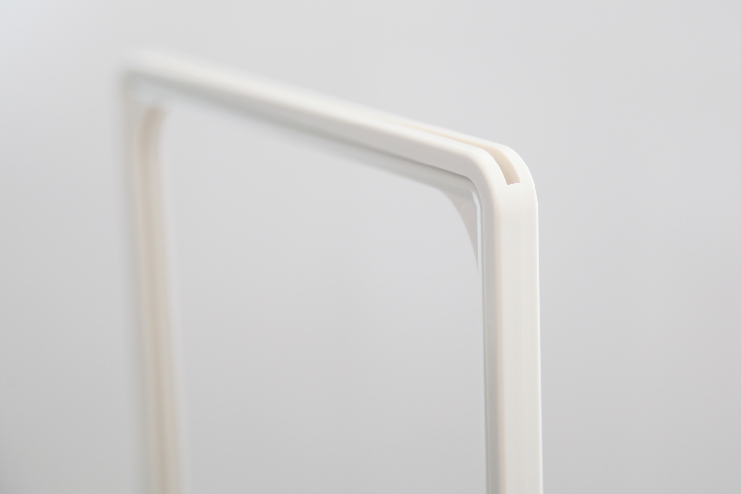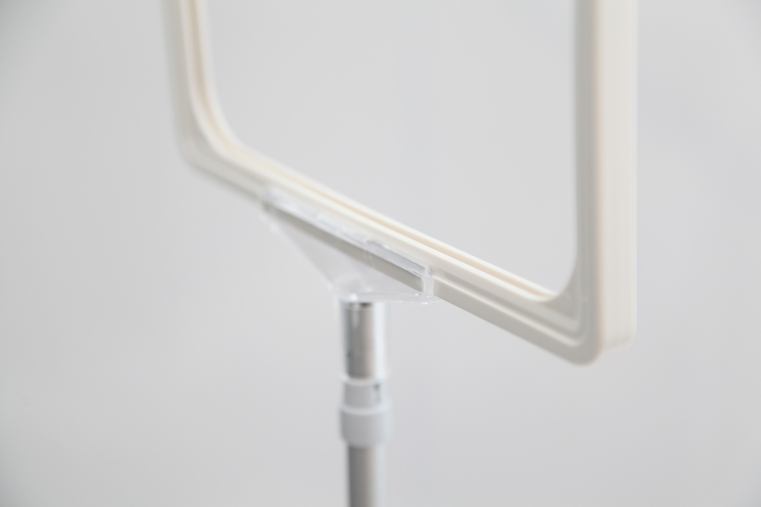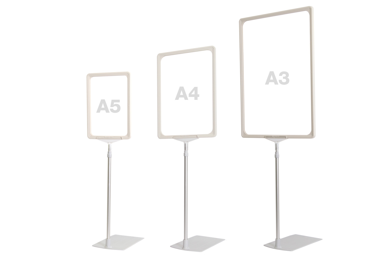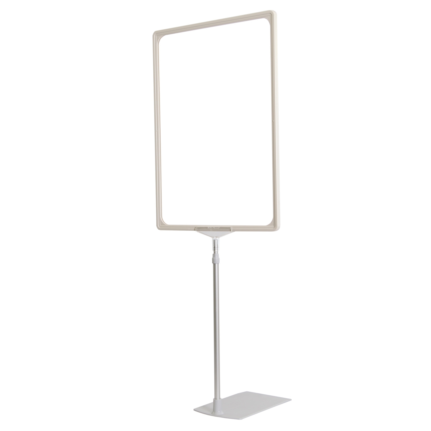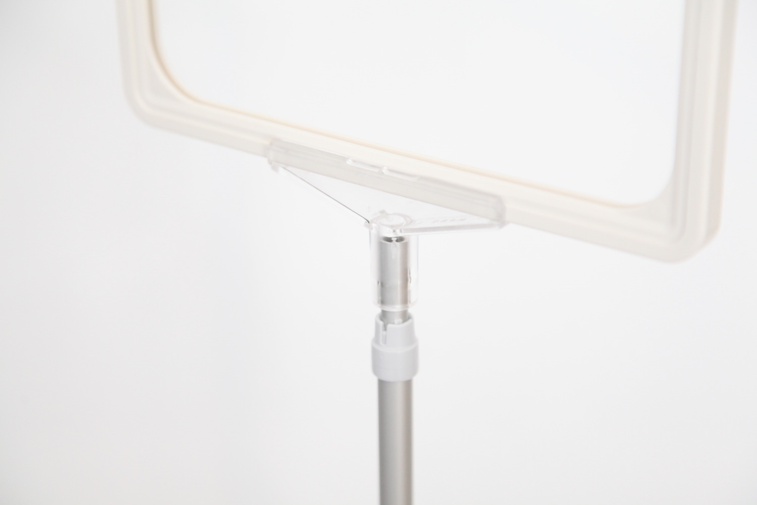 T-holder i toppen af stangen er gennemsigtig, så de passer med alle farver rammer. Rammen er lavet af hvid plast og har åbning i top (højformat / stående).