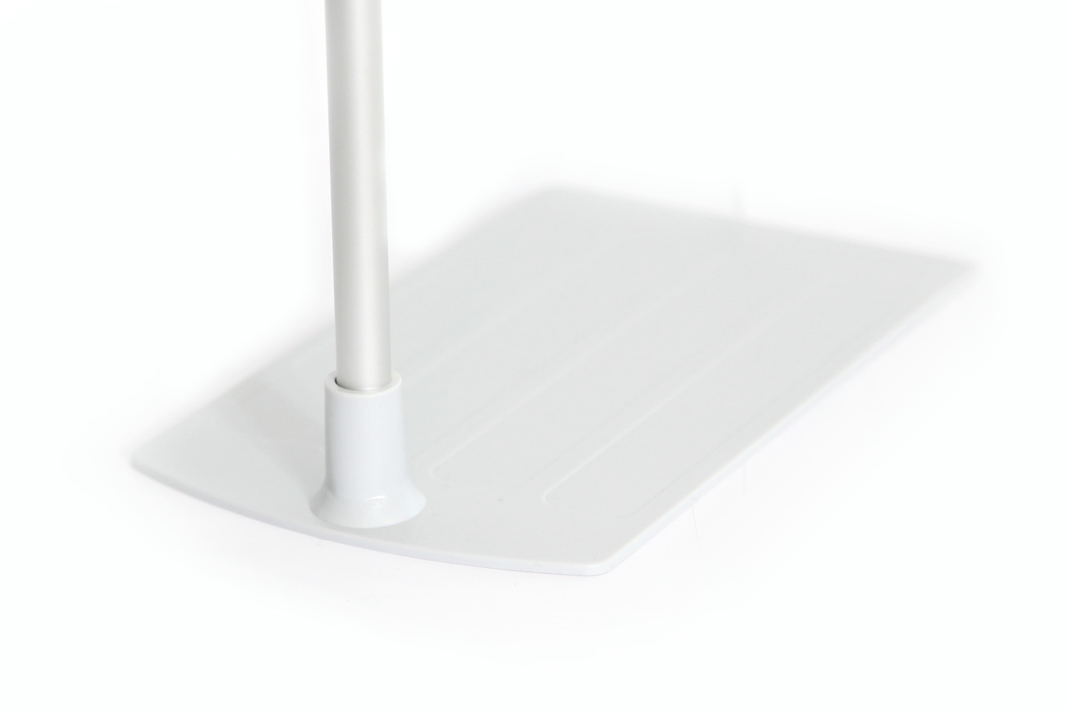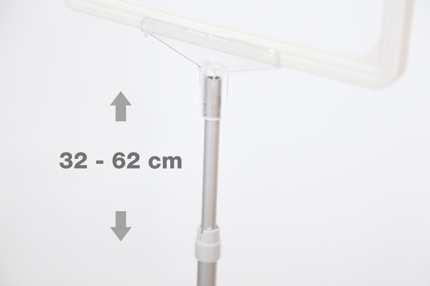 Lavpris skilteholdere, som er udstyret med en grå letvægtsfod af plast og en aluminium teleskopstang, som er justerbar i højden fra 32 - 62 cm.