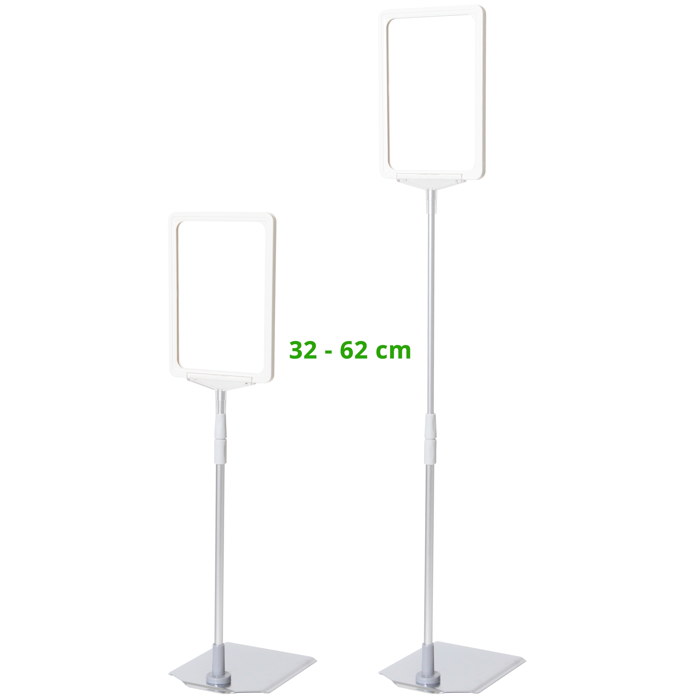 Topkvalitets skilteholder med flot tung og stabil metalfod med krom overflade, justerbar sølvelokseret aluminium teleskopstang ( 32 til 62 cm ) og hvid ABS plastik ramme i A5 størrelse