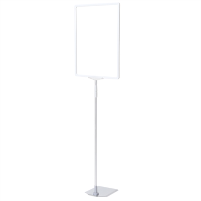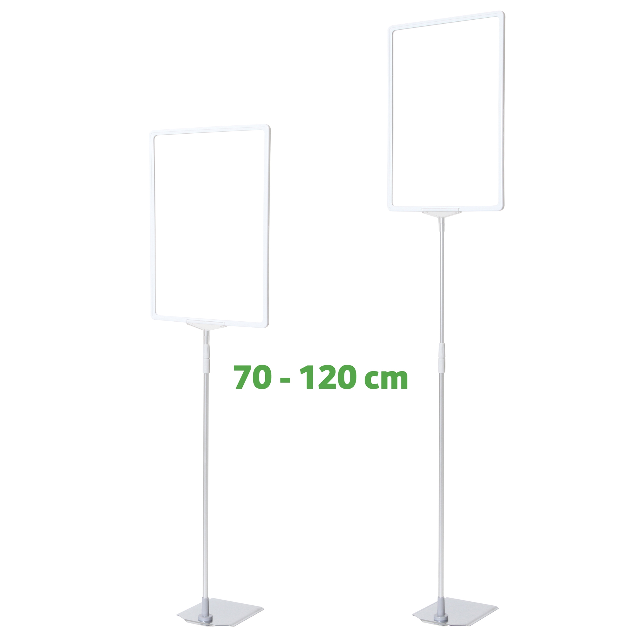 Topkvalitets skilteholder med flot tung og stabil metalfod med krom overflade, justerbar sølvelokseret aluminium XL teleskopstang ( 70 til 120 cm ) og hvid ABS plastik ramme i A3