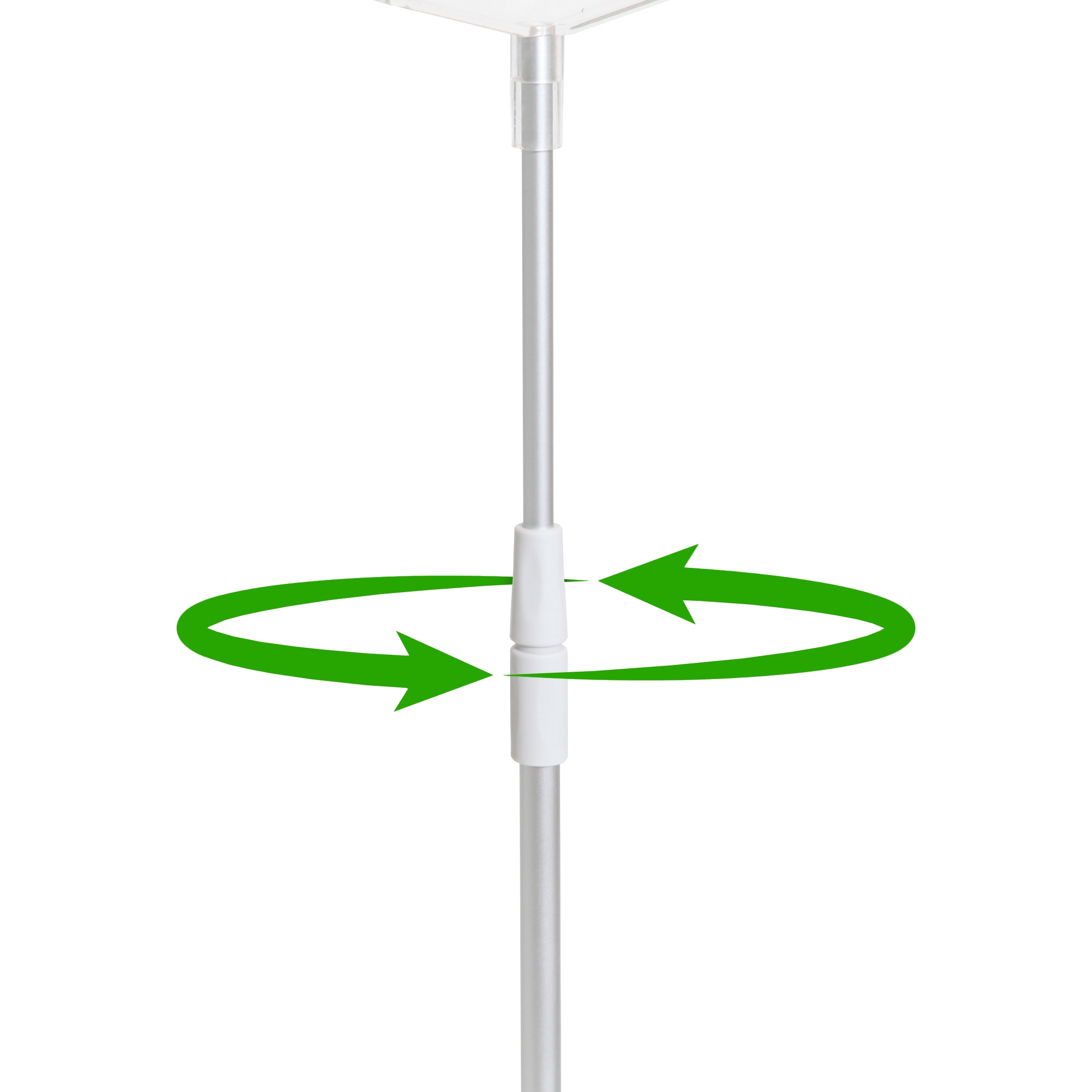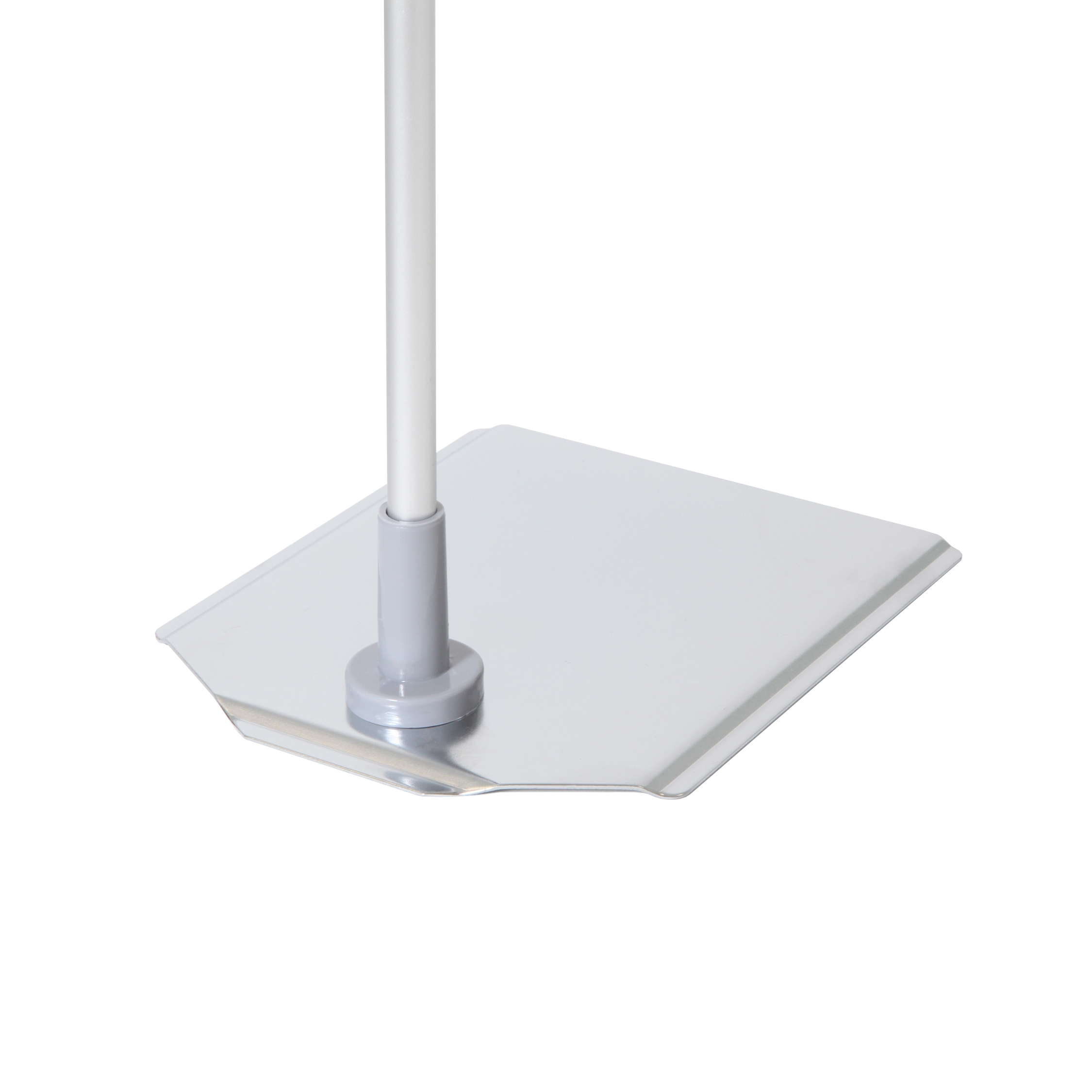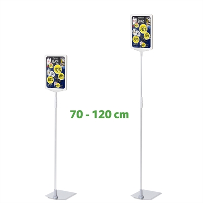Topkvalitets skilteholder med flot tung og stabil metalfod med krom overflade, justerbar sølvelokseret aluminium XL teleskopstang ( 70 til 120 cm ) og hvid ABS plastik ramme i A5