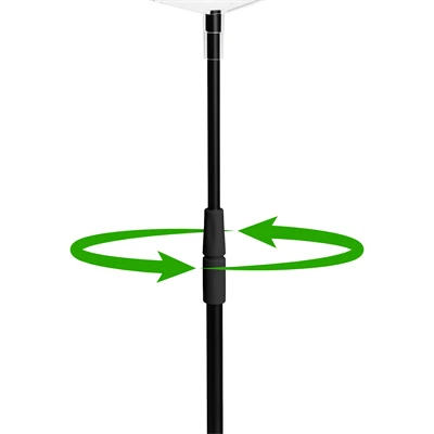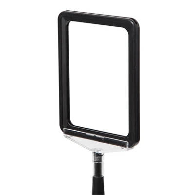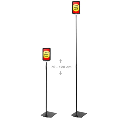 Skilteholderen er udstyret med en sort XL teleskopstang, som kan justeres fra 70 til 120 cm i højden, samt en sort A6 plast ramme med åbning i top (højformat).