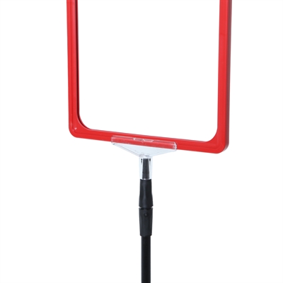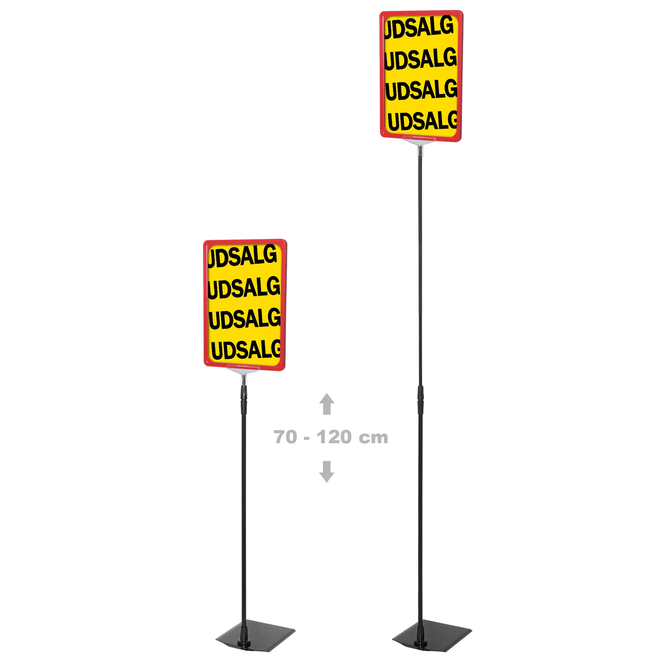 Skilteholderen er udstyret med en sort XL teleskopstang, som kan justeres fra 70 til 120 cm i højden, samt en rød A4 plast ramme med åbning i top (højformat).