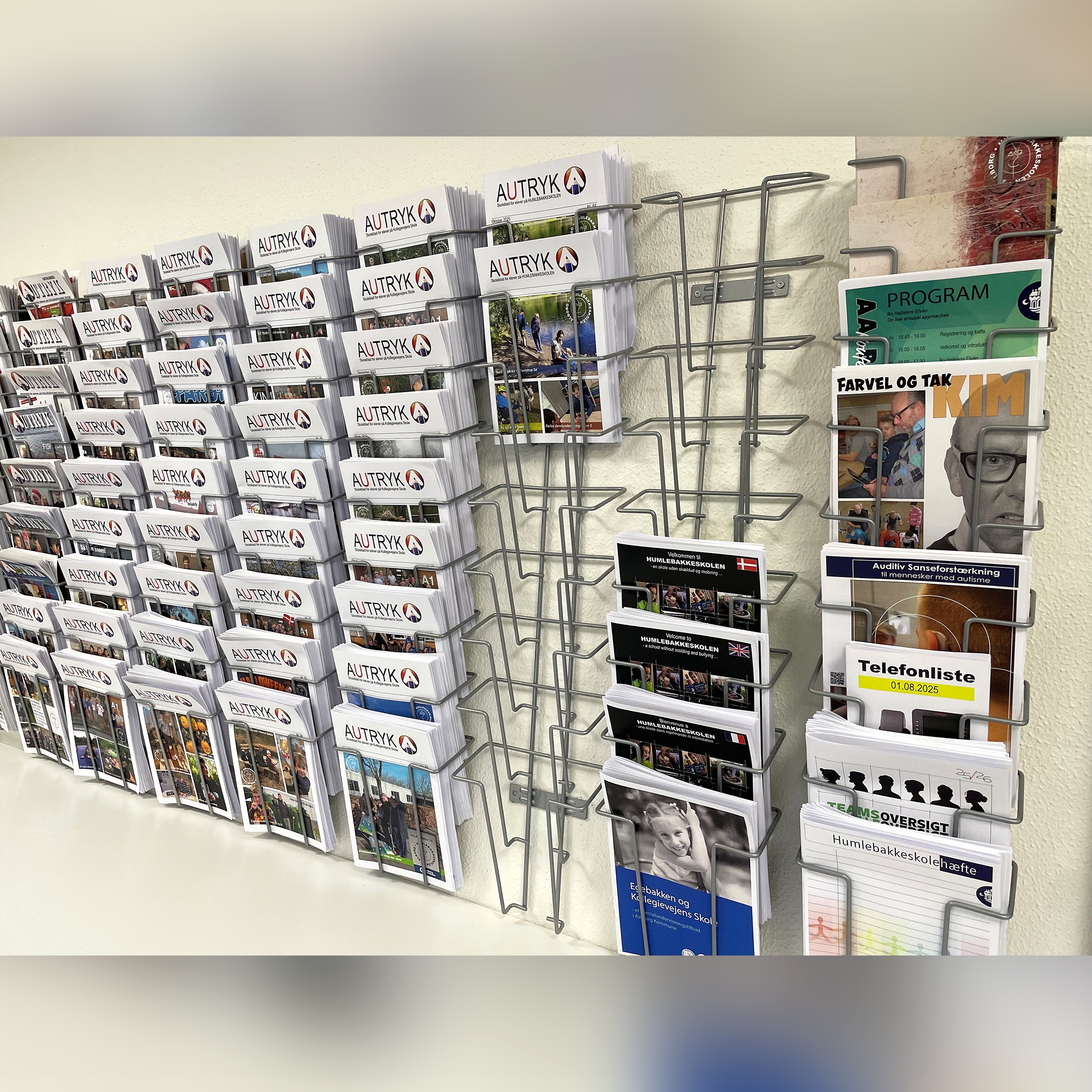 Brochureholder med 9 rum til A5-brochurer. Produceret i tråd. Polyesterlakeret i RAL9006 sølv. Til vægmontage.