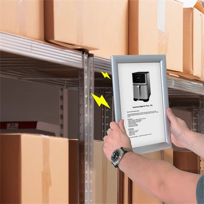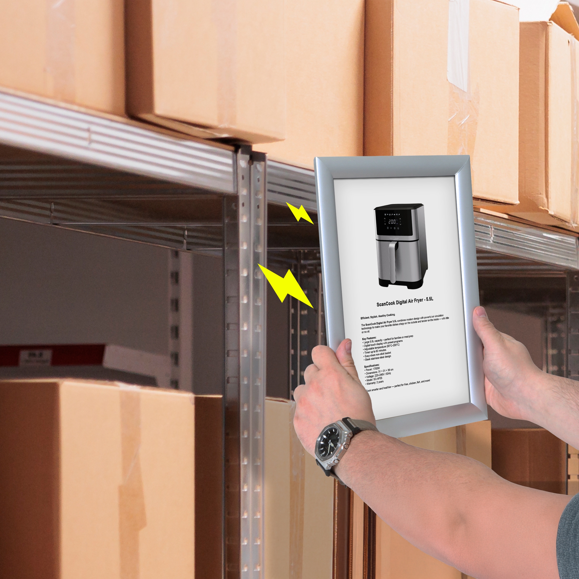 Frontprofilerne er fremstillet af sølveloxeret aluminium med en afrundet form, der giver et elegant og klassisk udtryk. Klikfunktionen gør det let at åbne rammerne og udskifte indholdet på få sekunder. Magnetbåndet sikrer stabil og fleksibel montering på alle magnetiske flader - perfekt til lagerreoler, døre, tavler og maskiner.