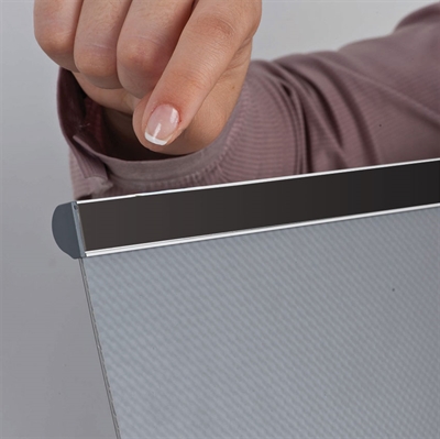 Fronten åbnes nemt, så du hurtigt kan udskifte indholdet. Den magnetiske montering gør skiltet perfekt til kontorer, receptioner, mødelokaler og andre steder, hvor du ønsker en elegant og flytbar skilteløsning.