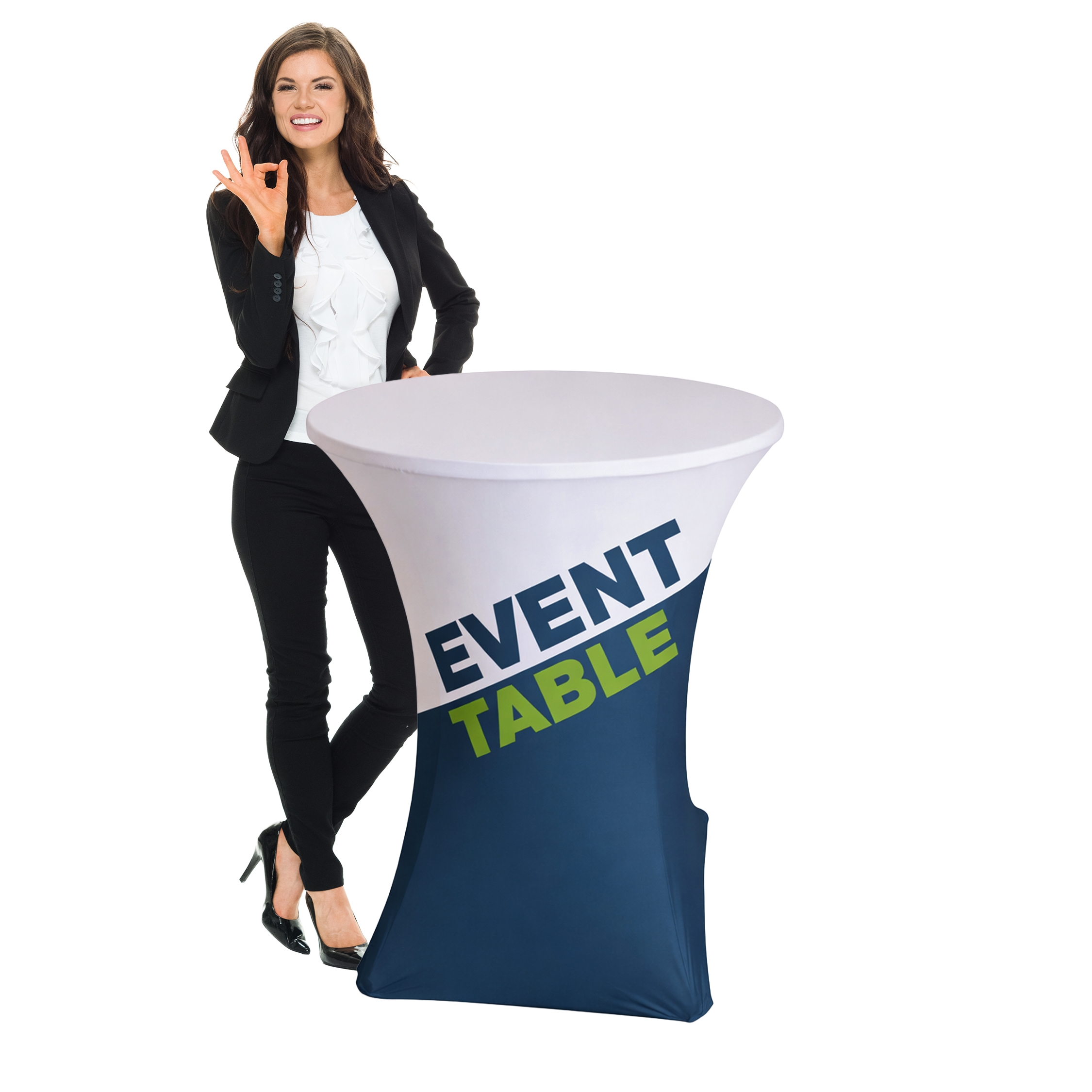 Rundt ståbord/klapbord med eget print, praktisk, elegant og alsidigt - perfekt til messer, events, og fester!