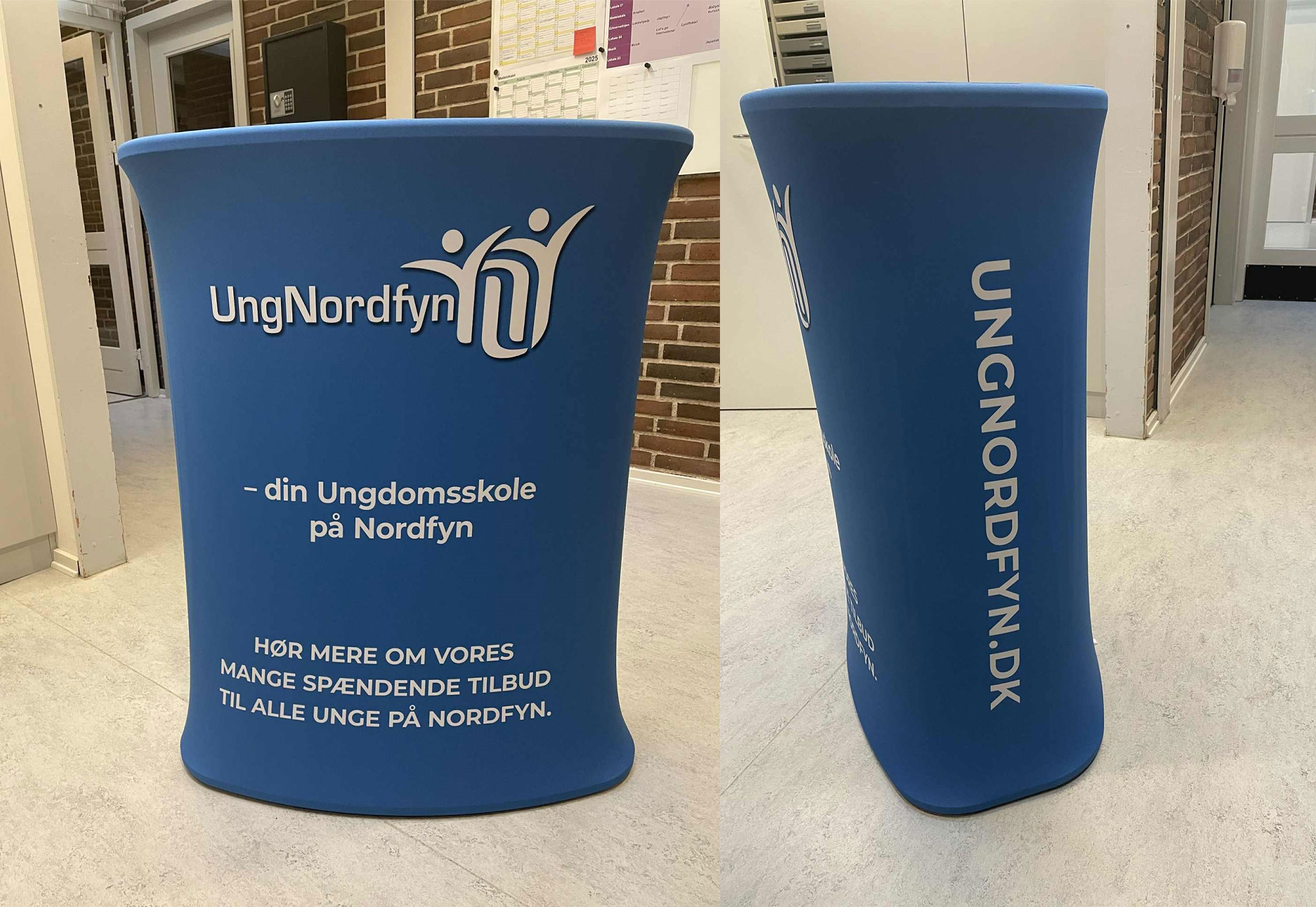 Stoffet består af B1 brandgodkendt topkvalitets strækbart 260g SEG ( Silicone Edge Graphics ) 100% polyester med fuldfarve tryk, som nemt indsættes i top- og bundpladernes silikonelister, og derefter lynes til på bagsiden. Bordet kan sammenklappes og udfoldes med printet monteret.