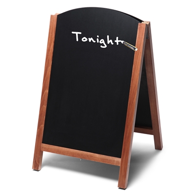 Flot fortovsskilt i lys brun bejdset hårdttræ med dobbeltsidede højtrykslaminerede tavler og elegant afrundet top.