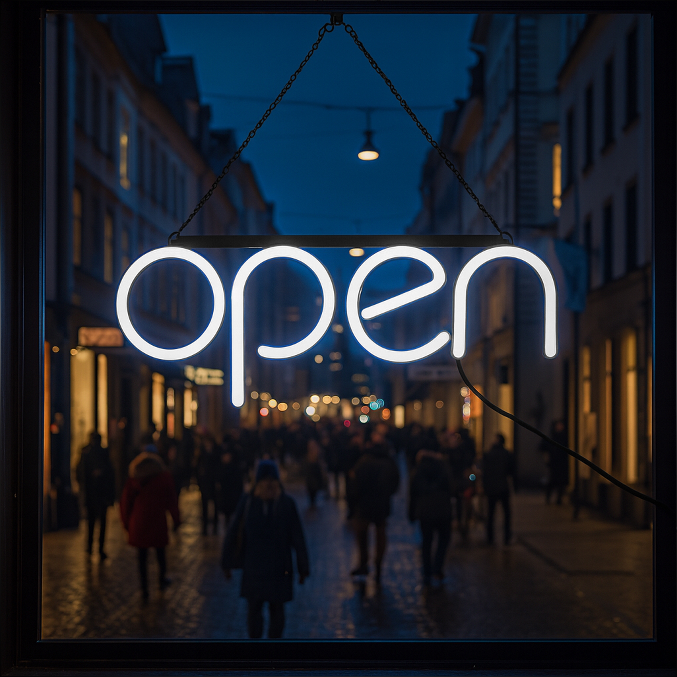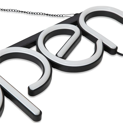 Tiltræk flere kunder og se din virksomhed vokse med vores OPEN LED Neonskilt. Skab opmærksomhed og vis alle omkring jer, at i er åbne for forretning! Vores skarpe og iøjefaldende hvide LED skilt vil bringe flere kunder gennem jeres døre. Farverigt og skinnende LED lys.