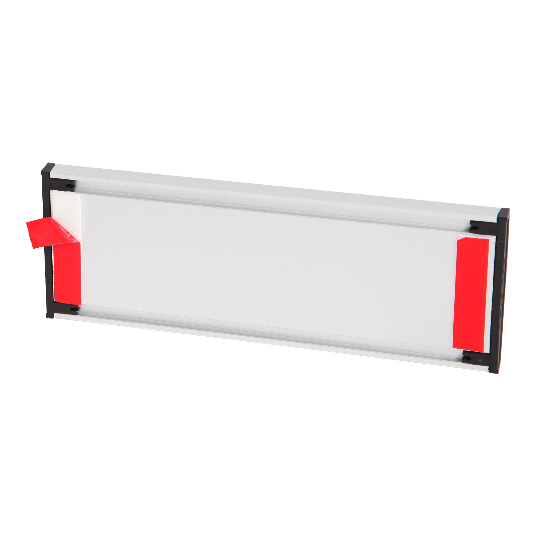 Skiltet er fremstillet i formpresset aluminium med sorte plast-endestykker, hvilket giver et stilrent og professionelt udtryk med høj finish og lang holdbarhed.