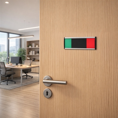 Premium Ledig / Optaget skilt er en eksklusiv og diskret løsning til statusmarkering, hvor der ønskes et rent, universelt og sproguafhængigt udtryk.
