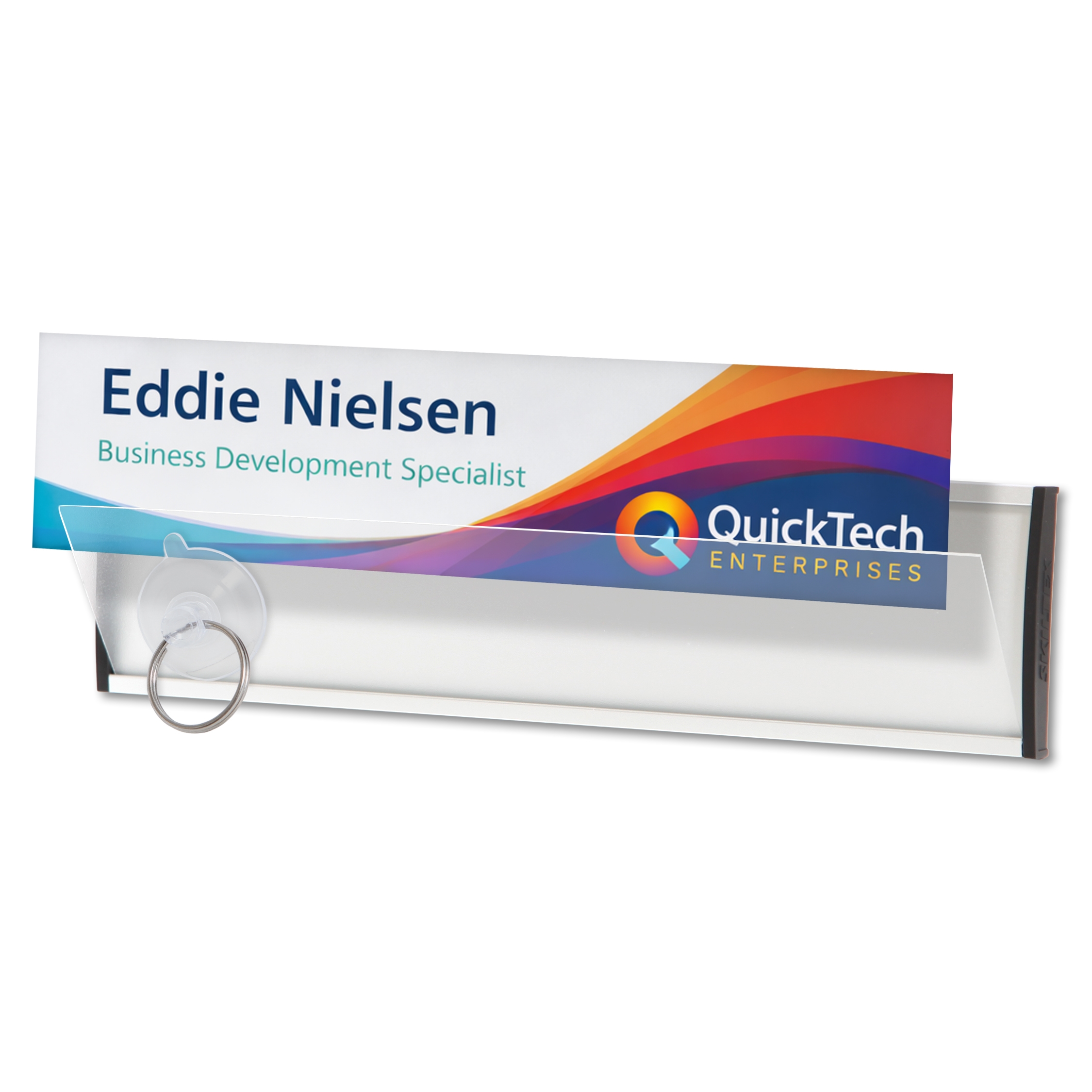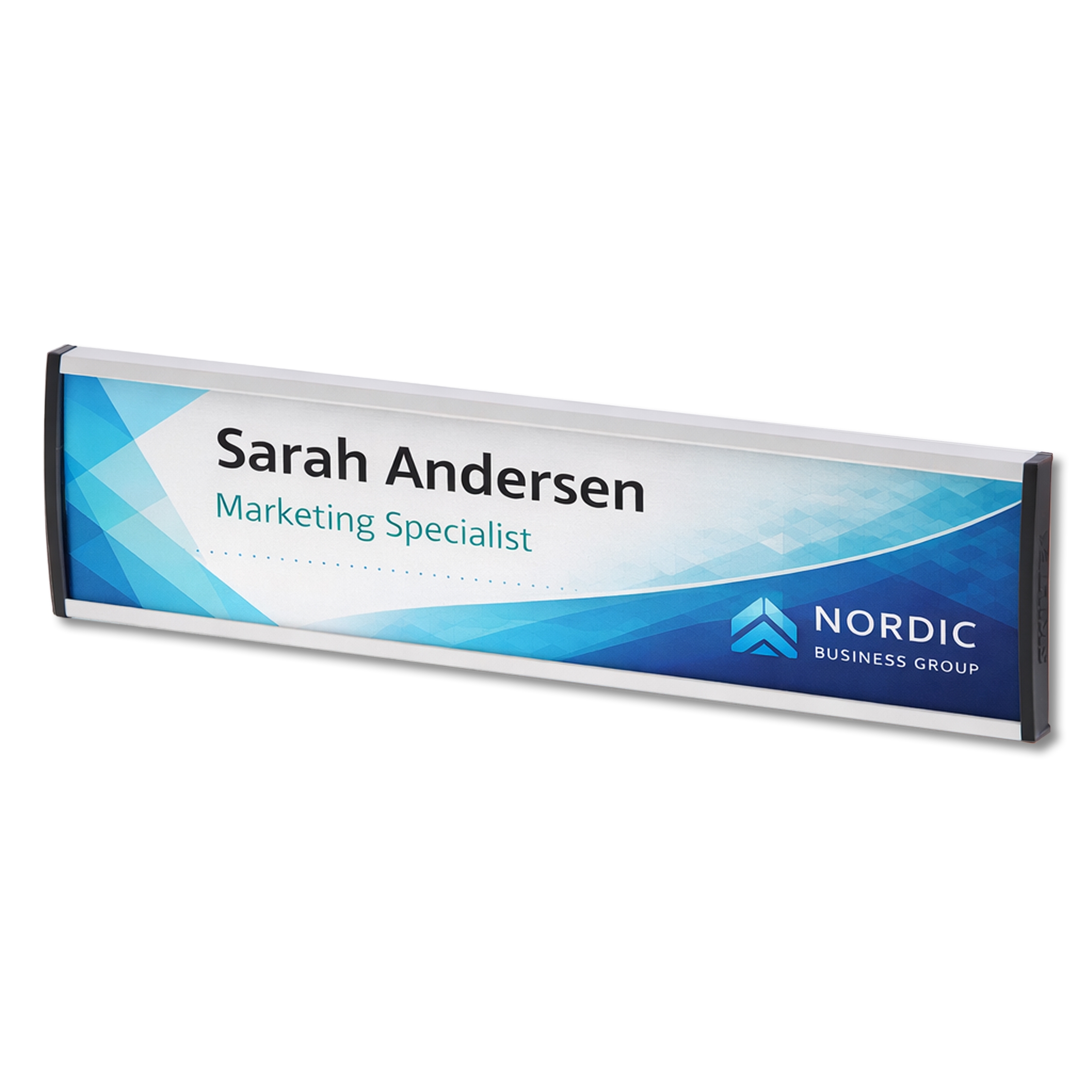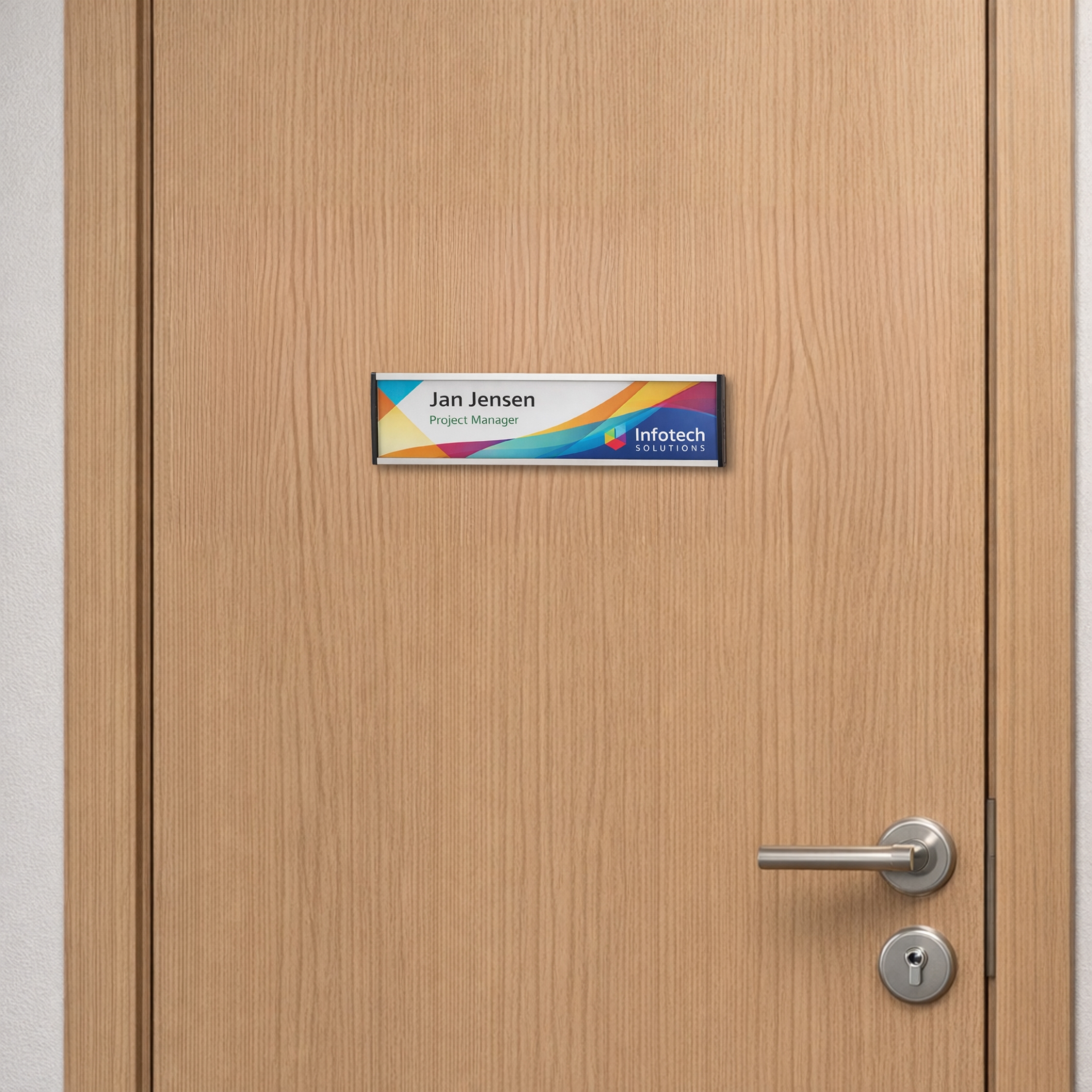 Skiltet er designet, så navne, afdelinger eller ruminformation nemt kan opdateres, når behovet opstår. Du skal blot udskifte printet i skiltet.