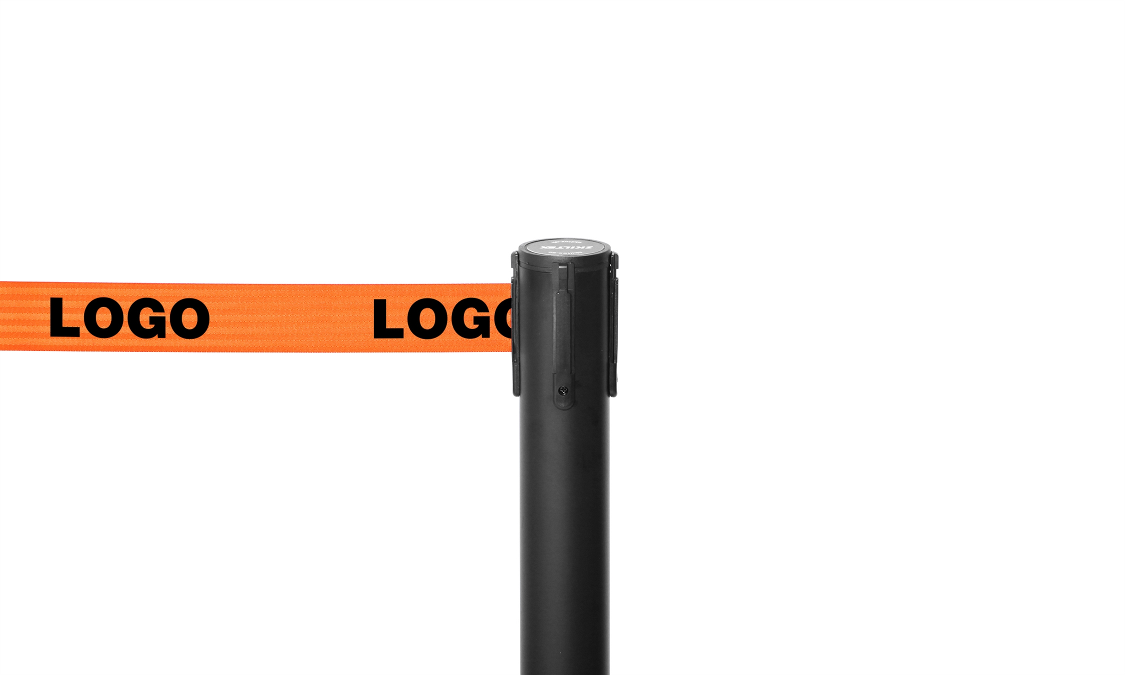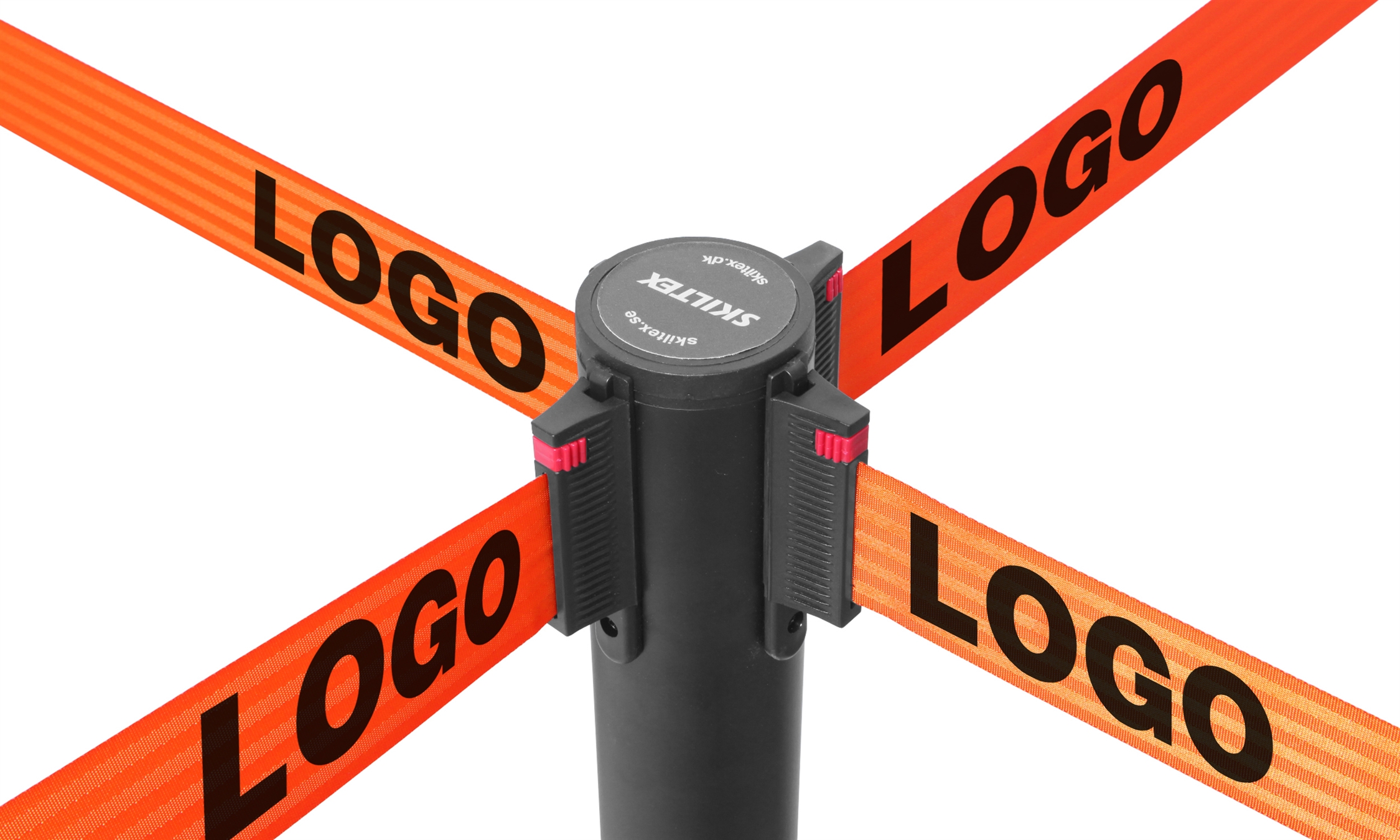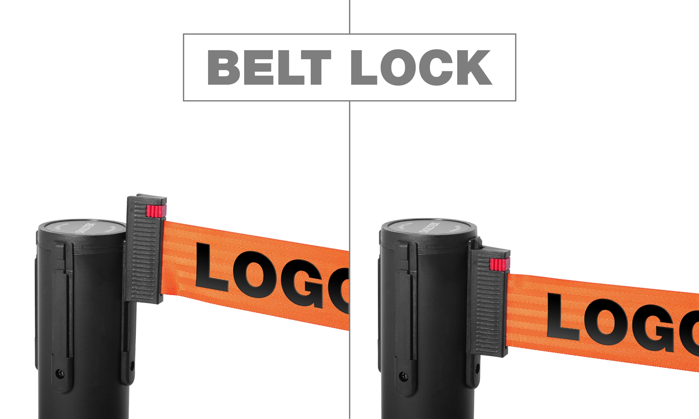 Båndene er udstyret med en lås, som sikrer, at de sidder godt og fast på andre stolper. Skiltex afspærringsstolper har en universel bånd-lås, som passer til andre populære afspærringstolpe-brands – med garanti.