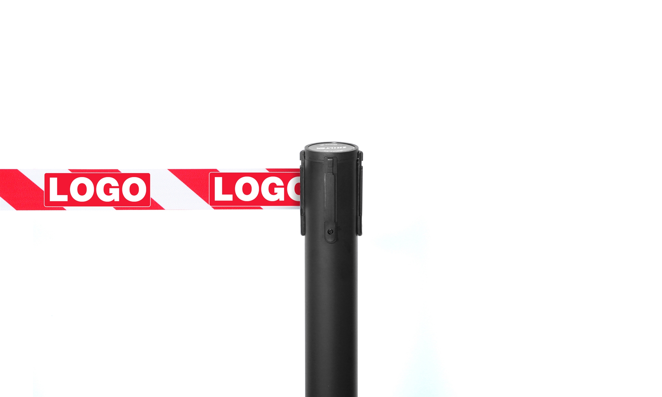 Sorte afspærringstolper med brugertilpasset tryk på begge sider af båndet.