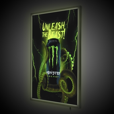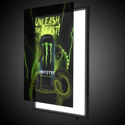 Smart, enkeltsidet klikramme med LED-lys, som lyser plakaterne op på en pæn og jævn måde.