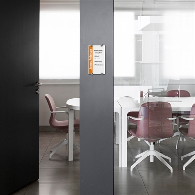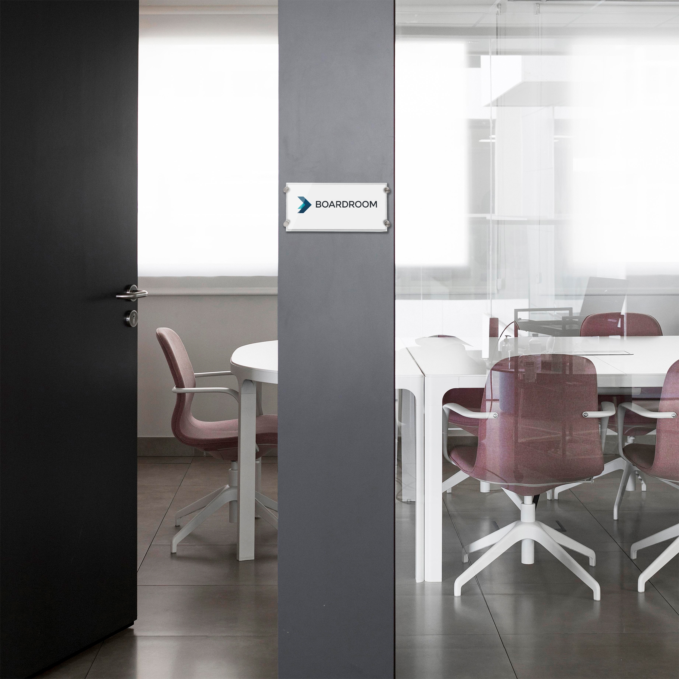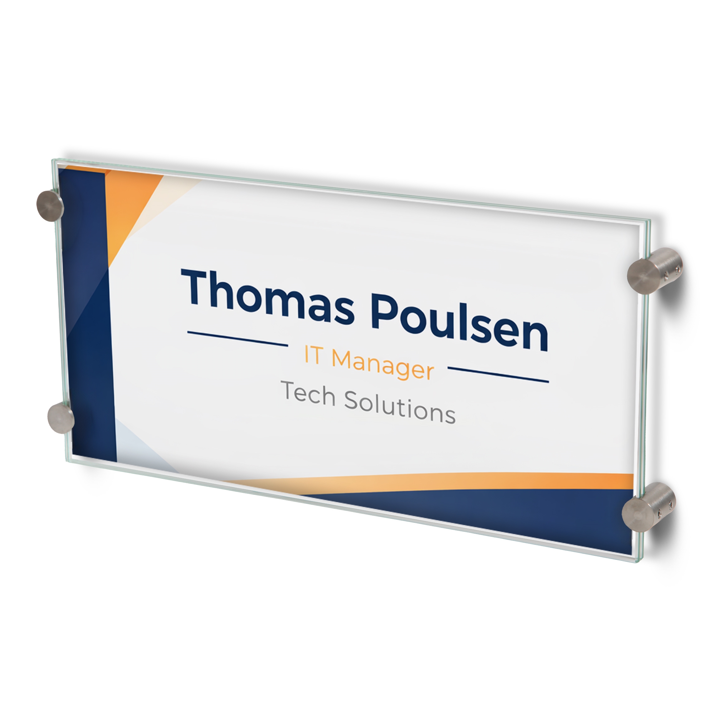 Et stilrent glasskilt, der passer perfekt til kontorer, mødelokaler, klinikker og andre professionelle omgivelser.