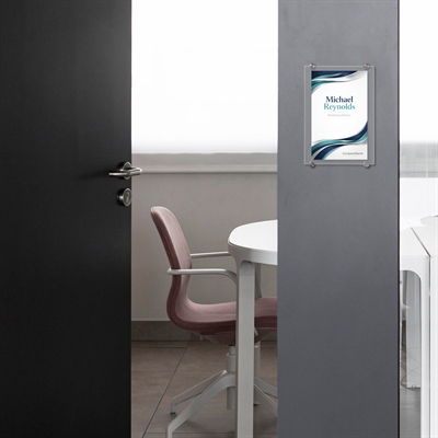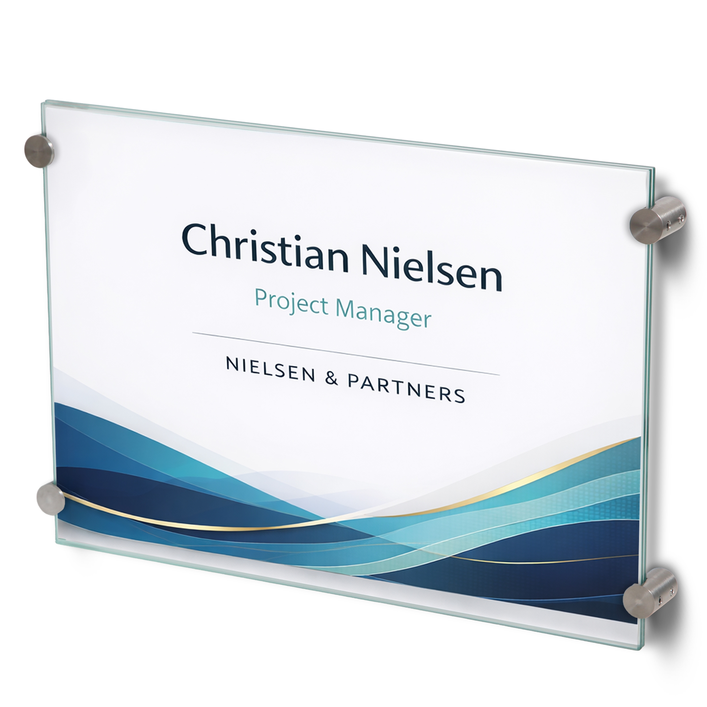 Et stilrent glasskilt, der passer perfekt til kontorer, mødelokaler, klinikker og andre professionelle omgivelser.