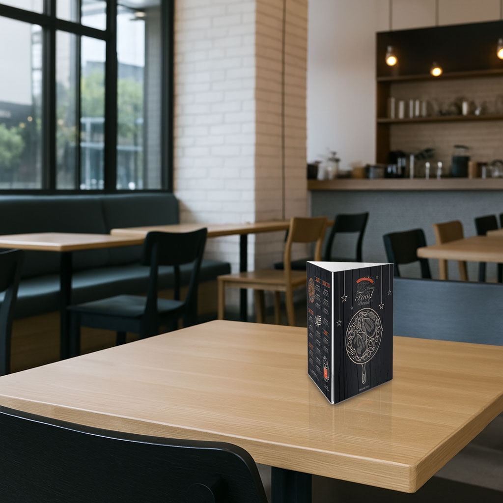 Økonomisk Pladsbesparende Menukortholder med 3 vertikale sider til optimal præsentation af menukort og prislister i A5 størrelse (14,8 x 21 cm)