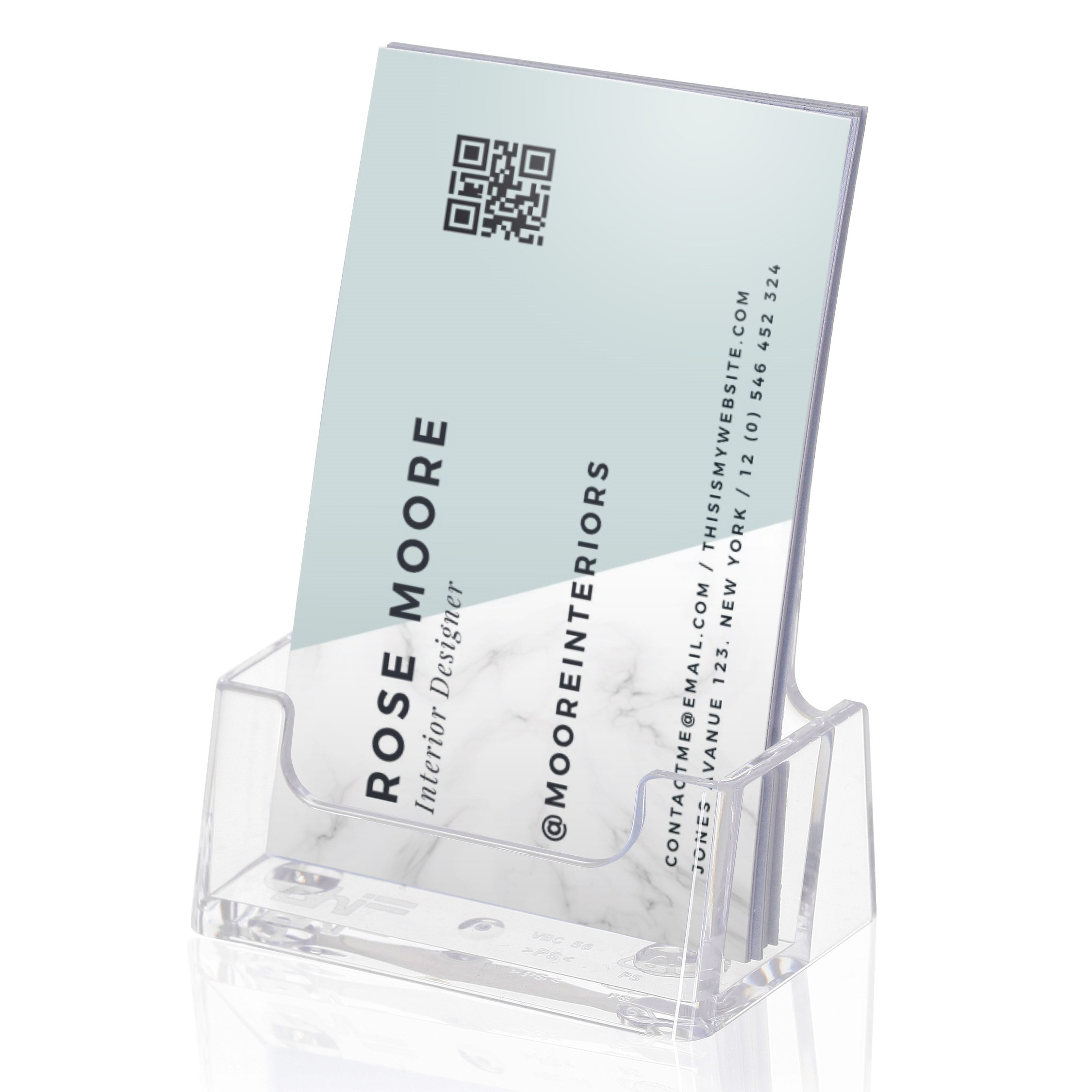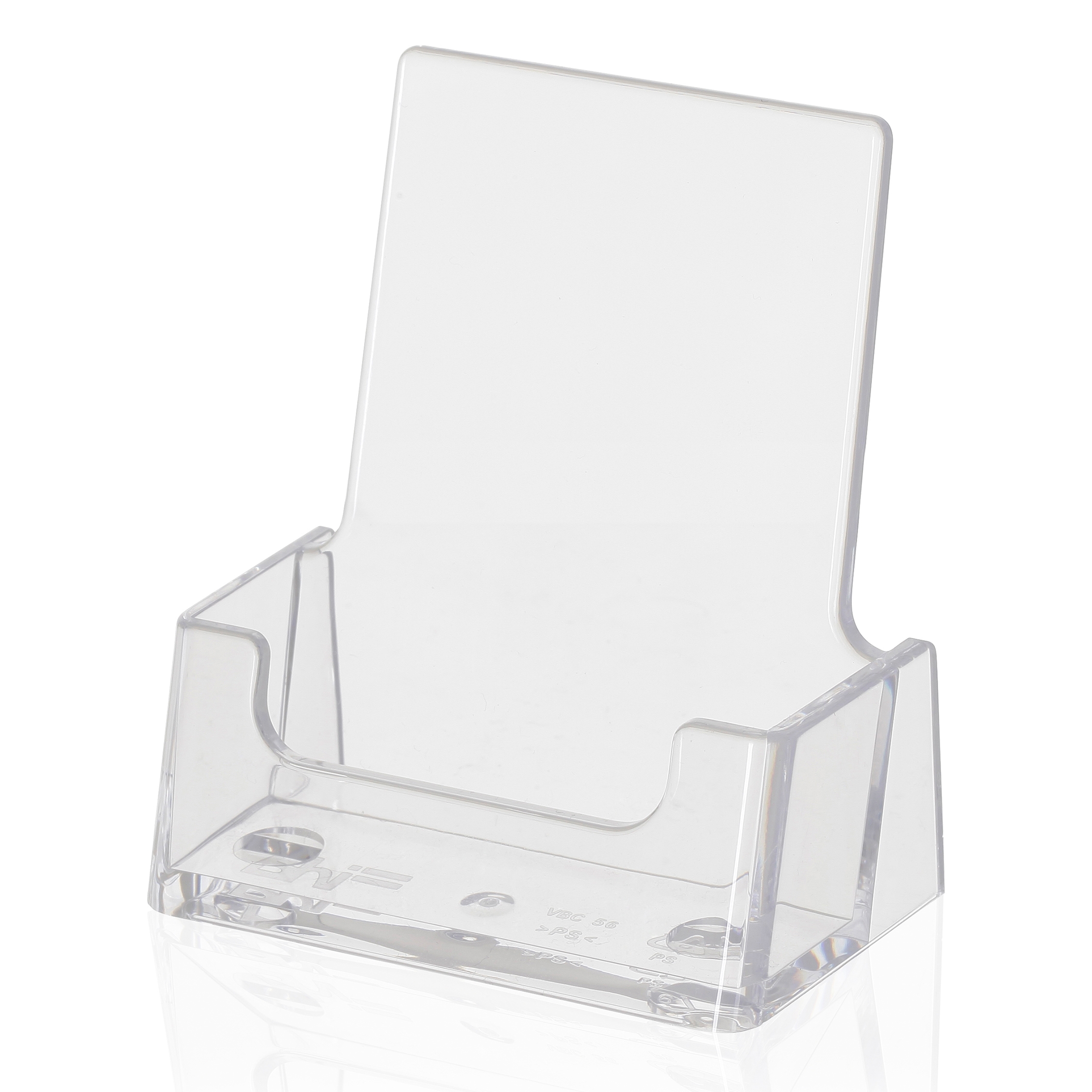 Denne højformat visitkortholder, som kan stå på en disk eller et skrivebord, er fremstillet i høj kvalitet i glasklar akryl.