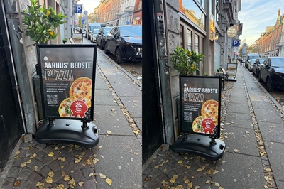 Selvom skiltet er tungt og stabilt er det relativt nemt at flytte inden- og udenfor, takket være de 2 hjul på foden. Skiltet kan simpelthen tippes til den én side og rulles.