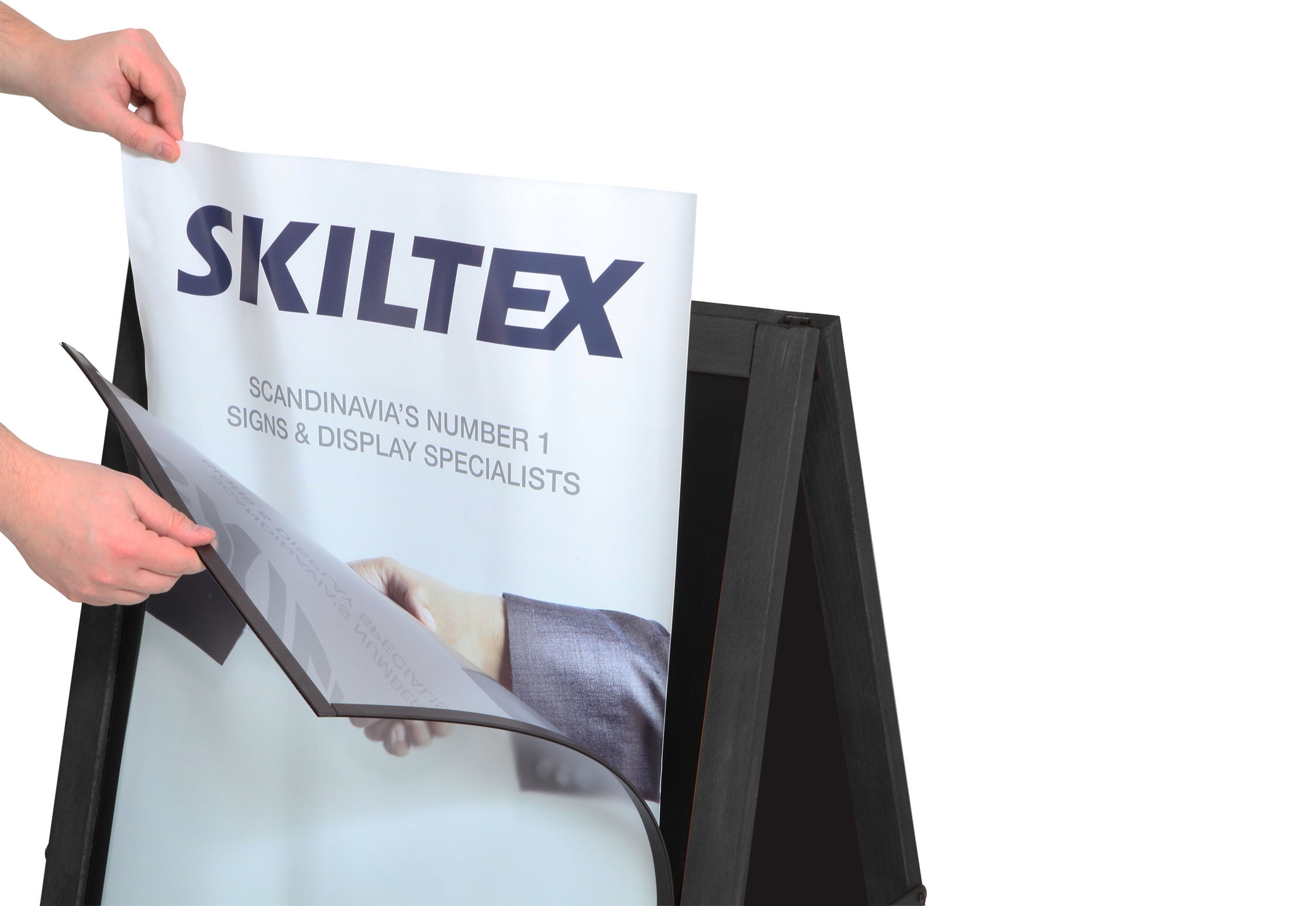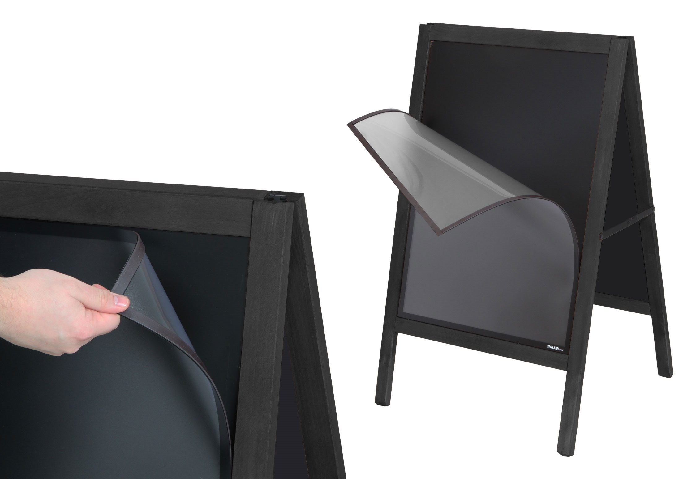 Dette fantastiske alsidige skilt kan bruges både som et traditionelt gadeskilt med A2 plakater eller som et kridttavle skilt, som kan skrives på med kridt eller kridtmarkers.